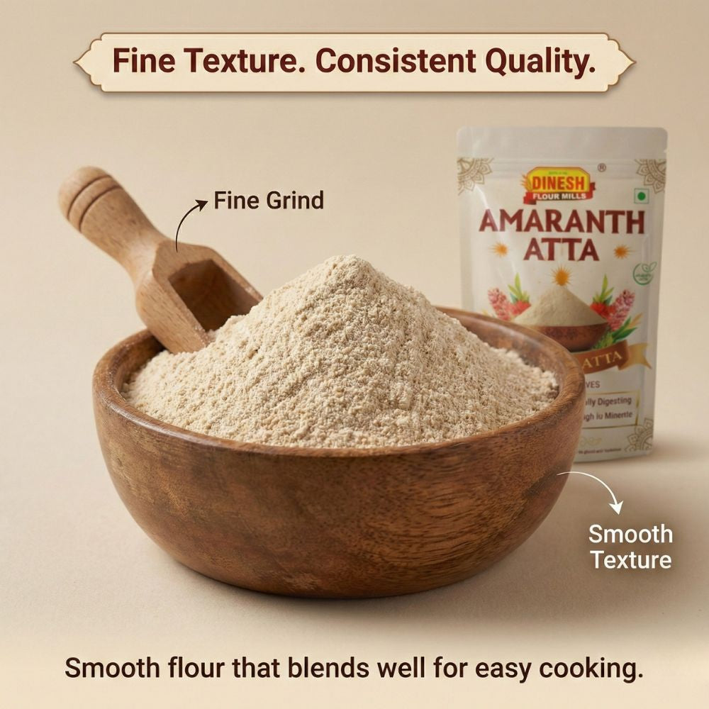 Dinesh Flour Mills Amaranth Atta, also known as Rajgira Atta, is prepared from carefully selected amaranth grains and ground fresh in small batches. Known for its clean taste and fine texture, this naturally gluten-free flour is widely used in traditional fasting recipes and everyday Indian cooking.