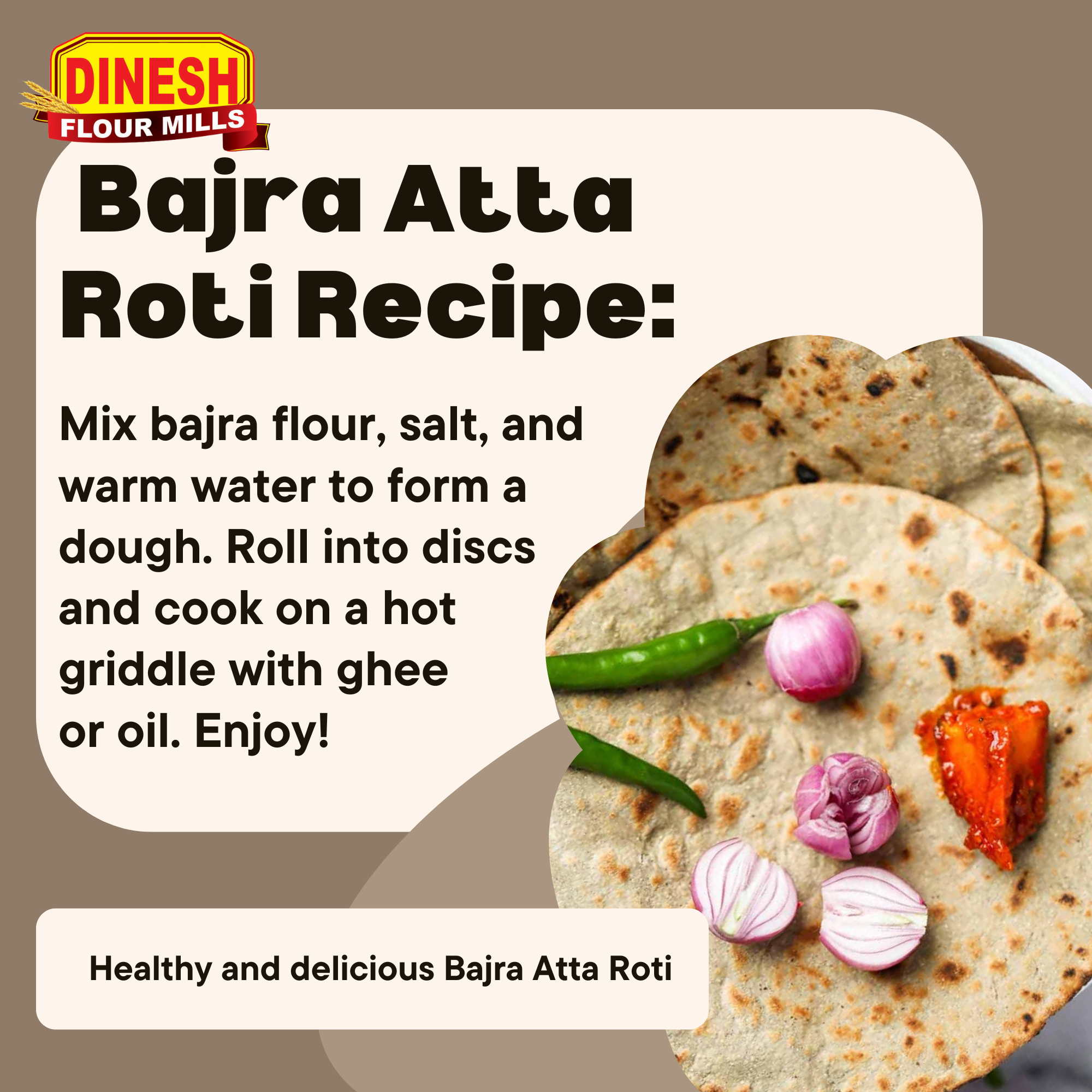 Versatile Usage: Use Dinesh Flour Mills Bajra Atta to make delicious rotis, parathas, bhakris, or even as an ingredient in cakes and cookies. Its nutty flavor adds depth to any recipe.