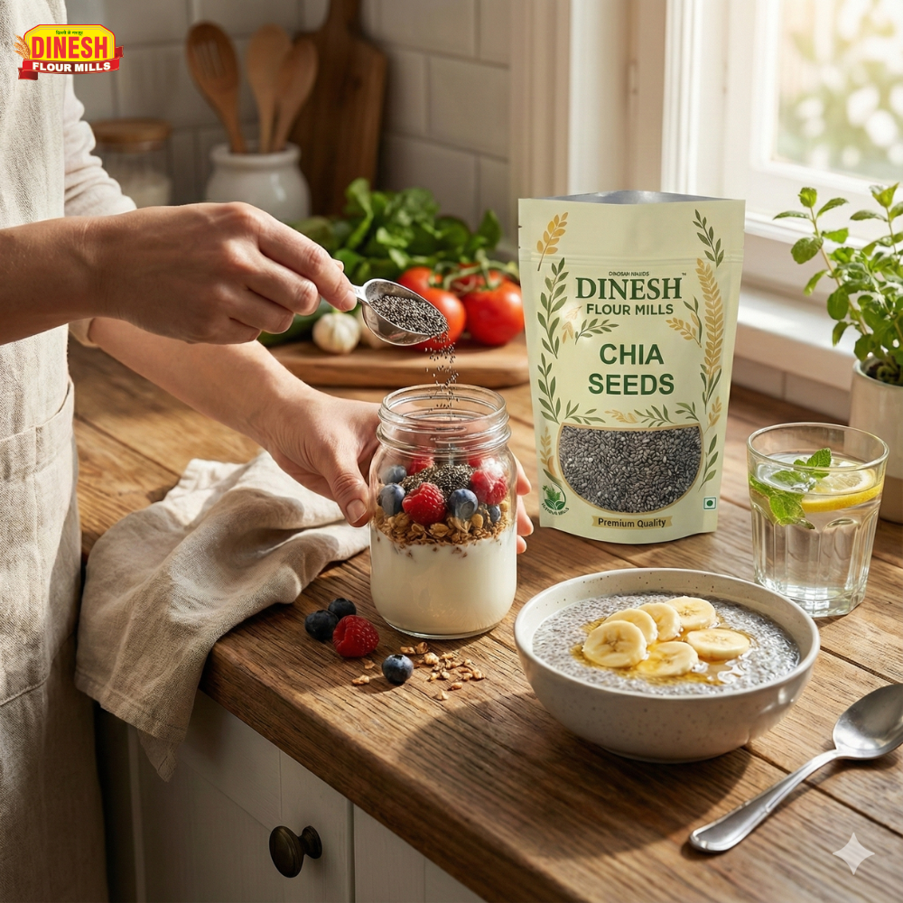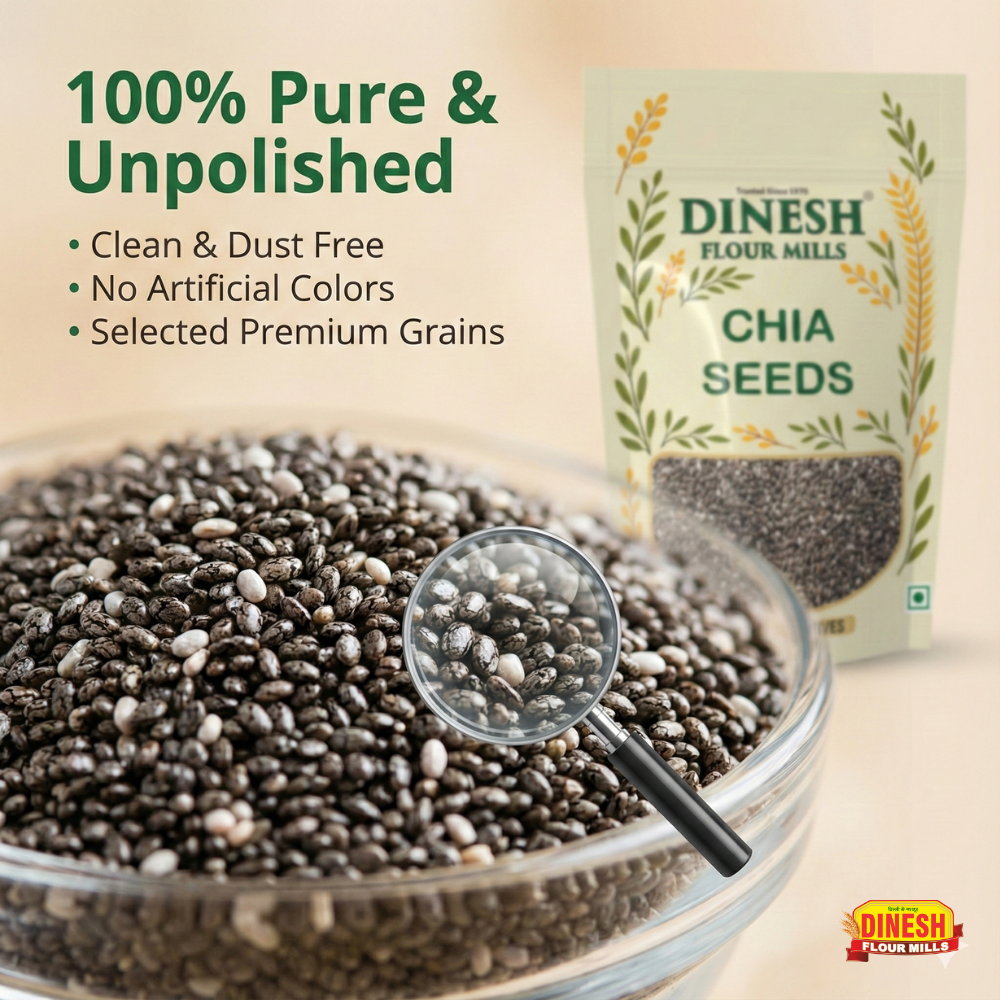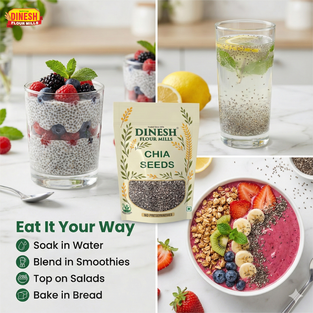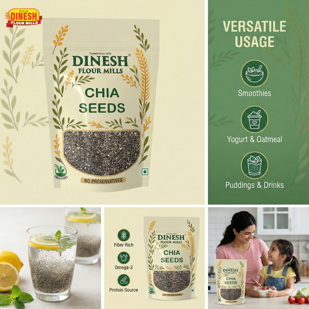 Follow us on social media for recipe ideas, cooking inspiration, and the latest product updates. Unlock your kitchen's potential with Dinesh Flour Mills Chia Seeds!