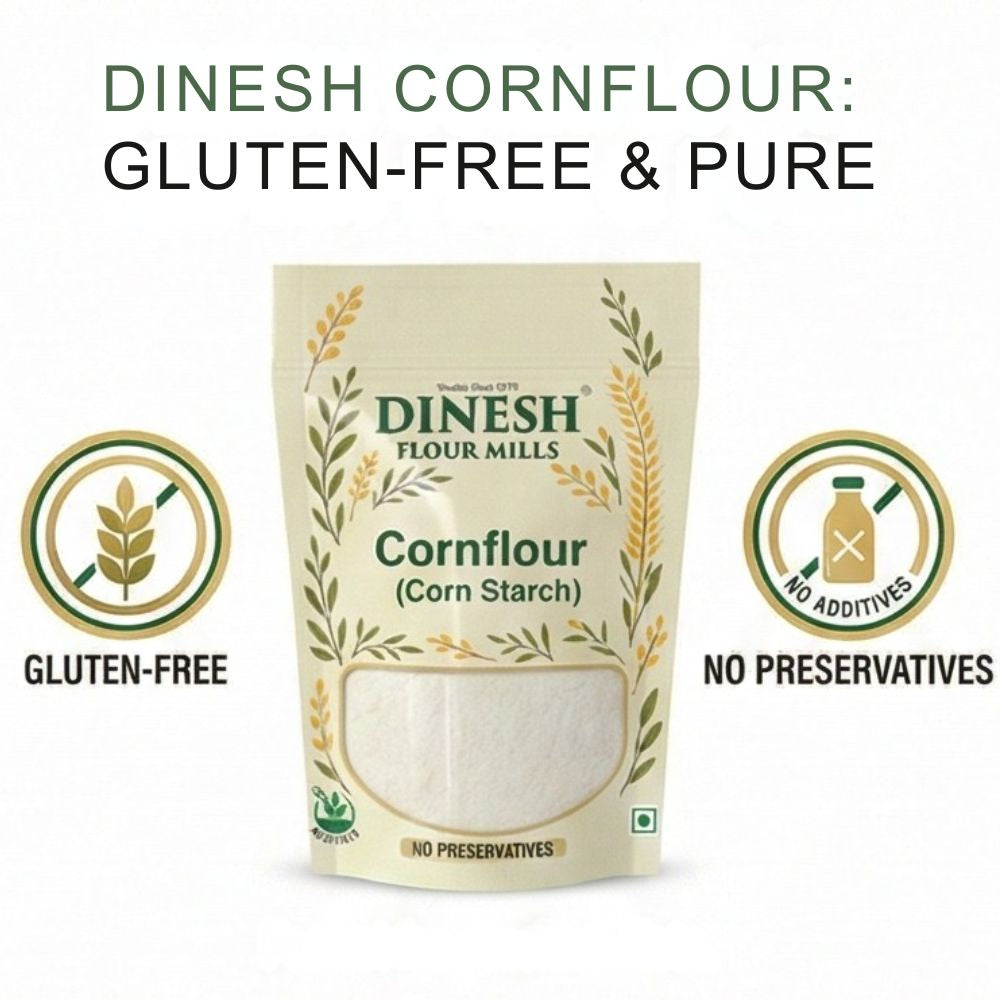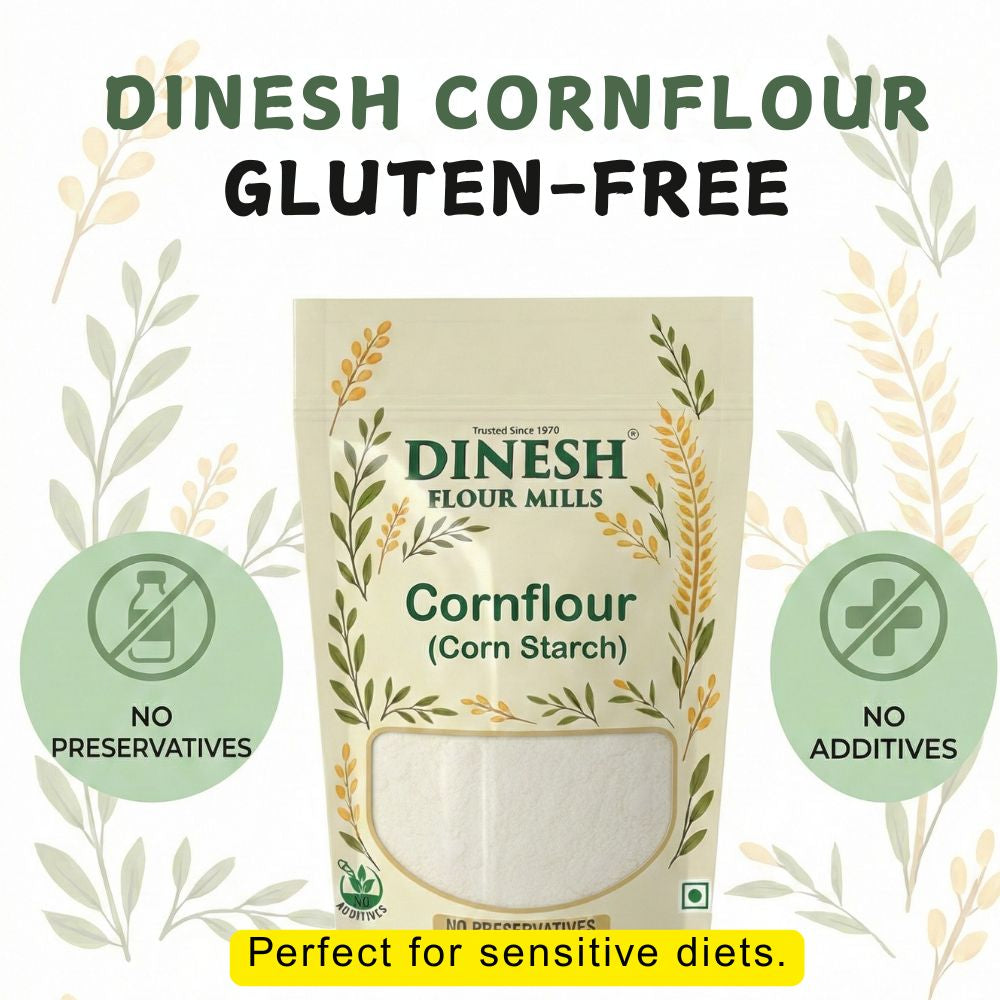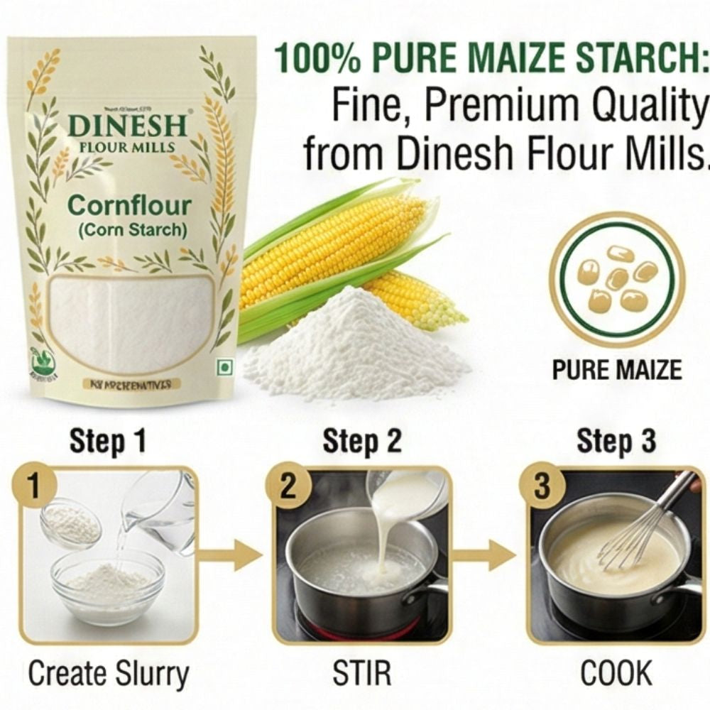 Dinesh Flour Mills Cornflour (Corn Starch) is finely processed for smooth mixing and consistent results. Ideal for thickening soups, gravies, sauces, and baking recipes. Prepared fresh with no added preservatives. Trusted quality since 1970.