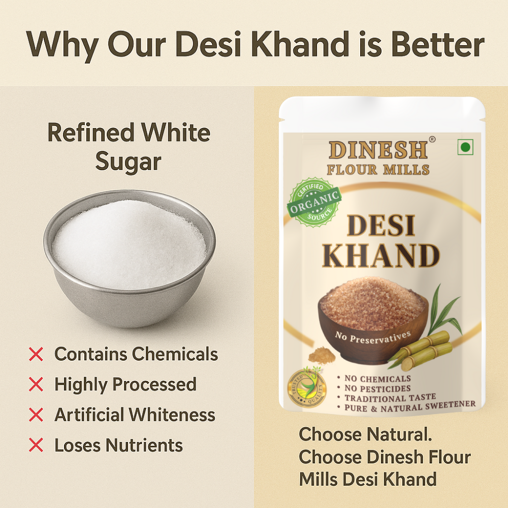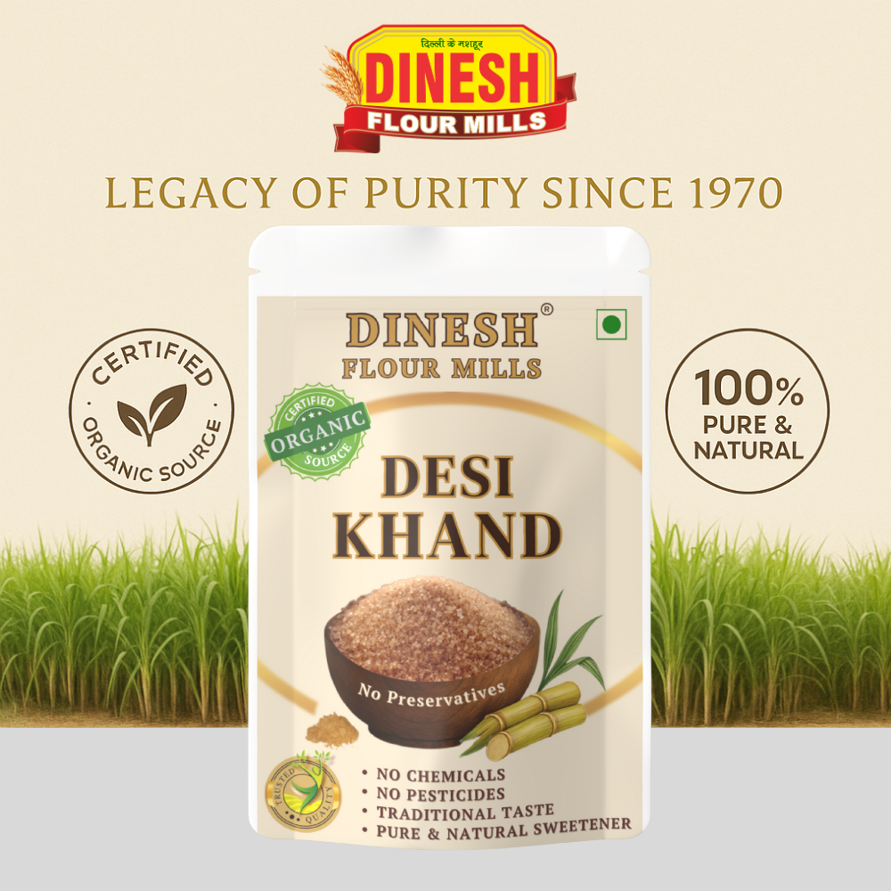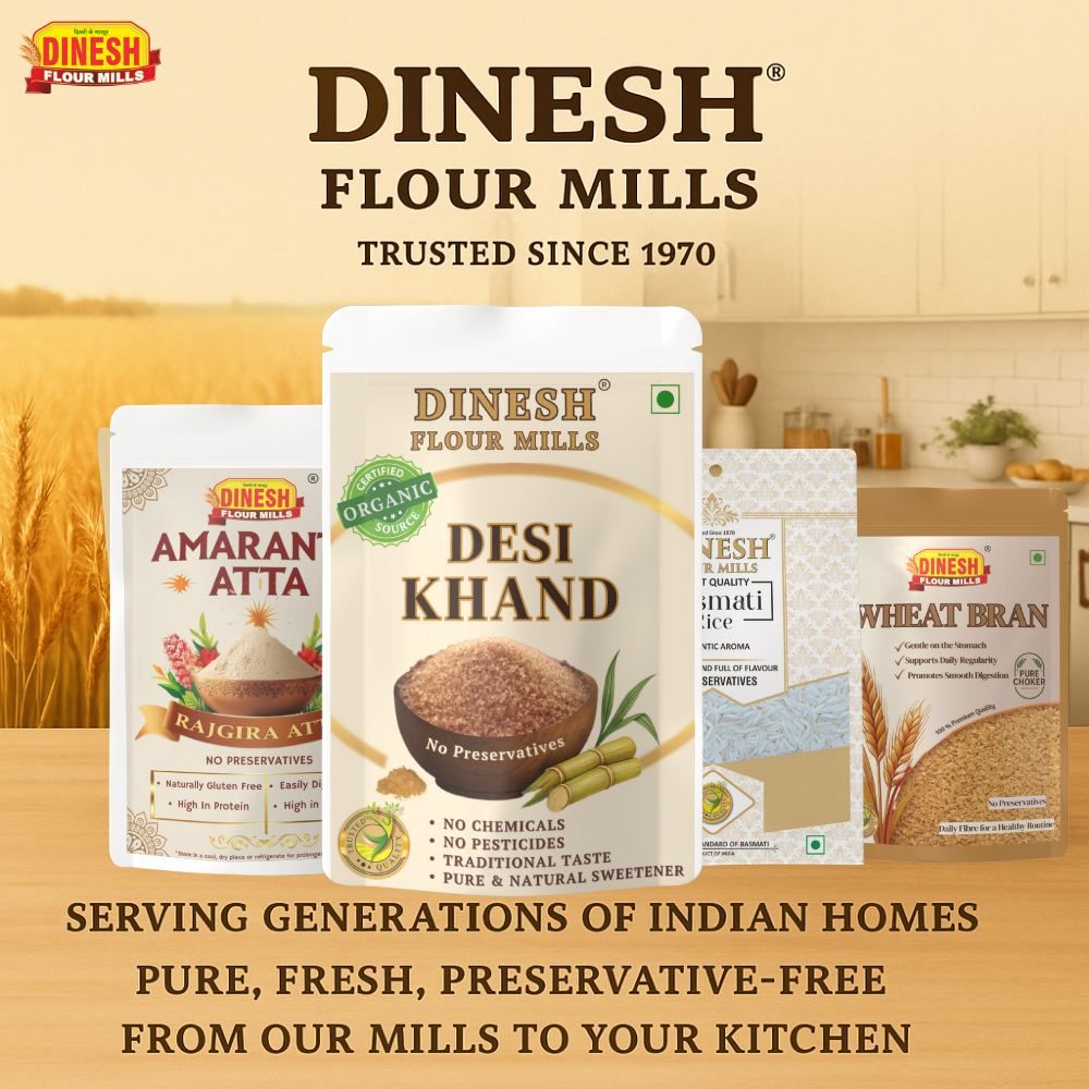 For over five decades, Dinesh Flour Mills has been the first choice of Indian households. From freshly milled atta to Desi Khand, dals, and rice, every product carries the same promise – purity, freshness, and authentic taste. With no preservatives, no chemicals, and a legacy of trust, we bring farm-fresh quality straight to your kitchen.