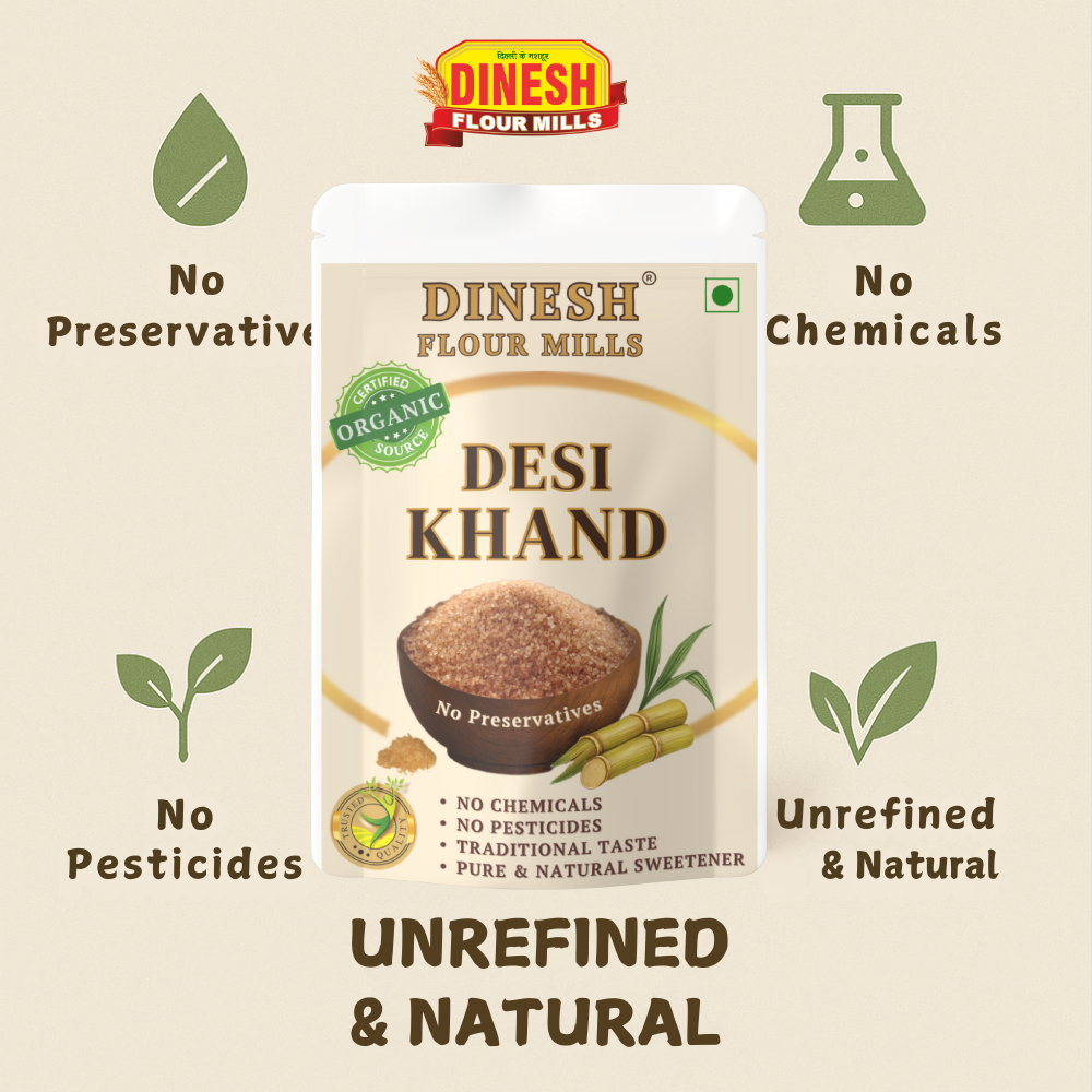 Dinesh Desi Khand is made from a certified organic source, free from preservatives, pesticides, and chemicals. This unrefined natural sweetener retains its authentic taste and golden texture, making it a healthier alternative to refined sugar for your daily chai, mithai, and baking.”