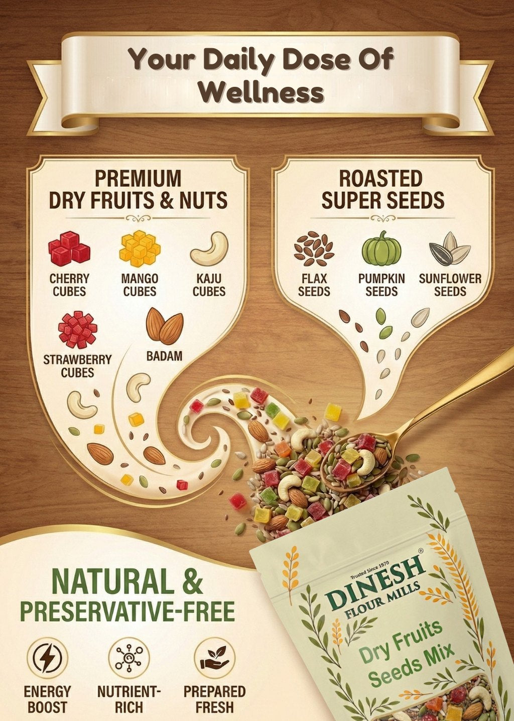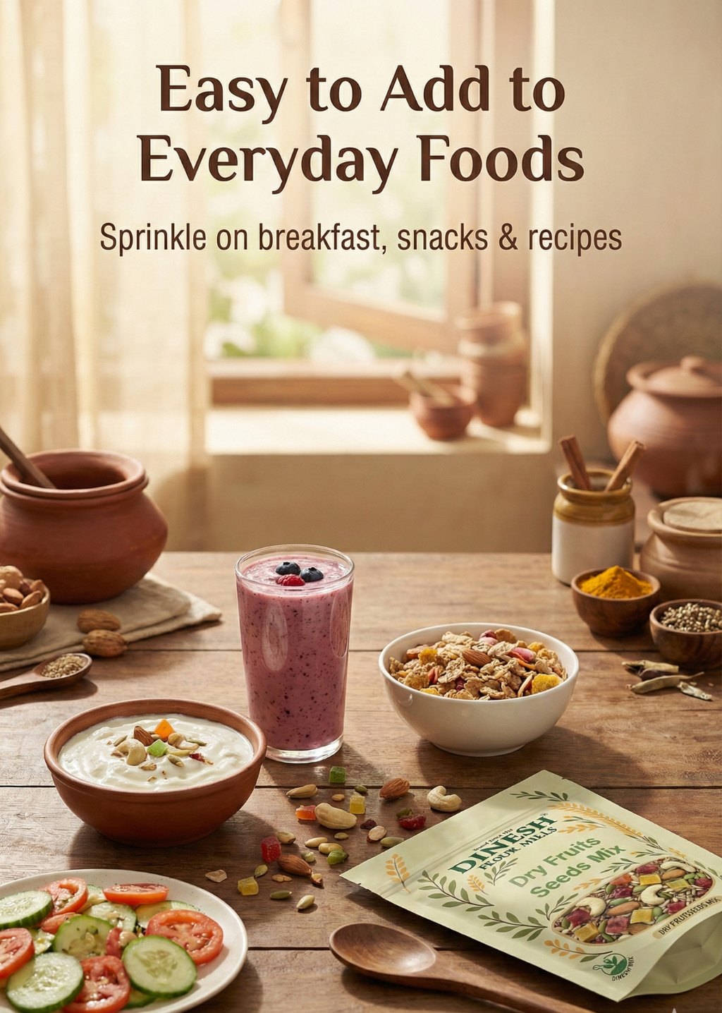 Bring variety and crunch to your everyday meals with Dinesh Flour Mills Dry Fruits & Seeds Mix. This thoughtfully prepared mix combines selected dry fruits and roasted seeds for balanced taste and texture.