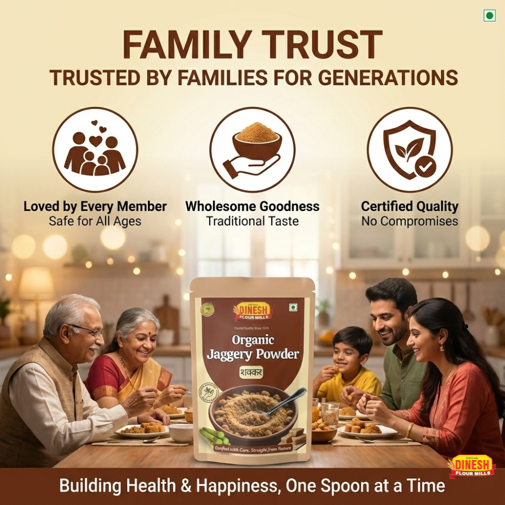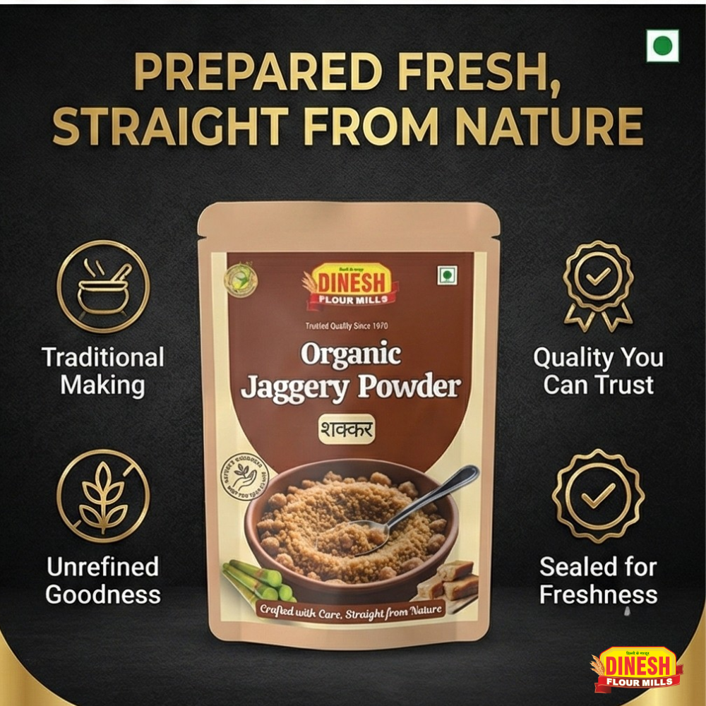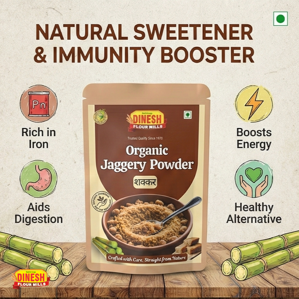 Dinesh Flour Mills Organic Shakkar is finely ground jaggery powder prepared from naturally sourced sugarcane. It has a rich aroma, earthy colour, and a mildly sweet taste that fits perfectly into everyday Indian cooking.