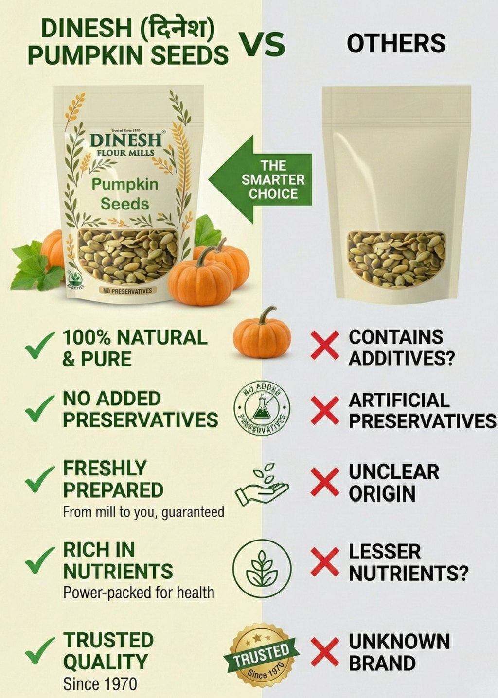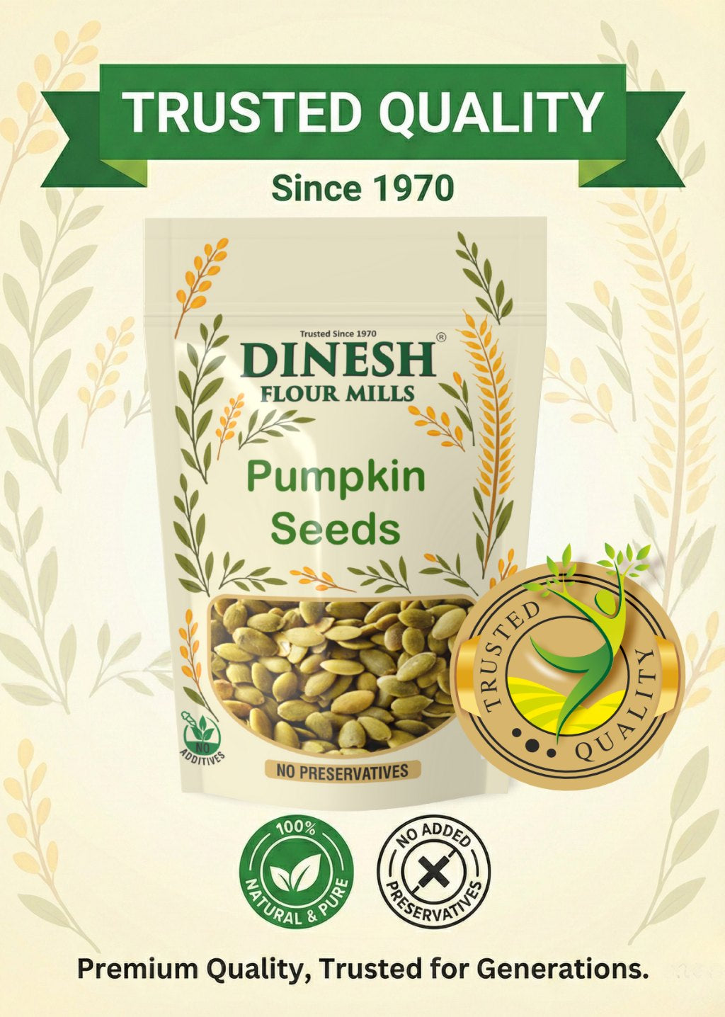 Buy premium Pumpkin Seeds from Dinesh Flour Mills. 100% natural, no preservatives, carefully prepared and hygienically packed. Ideal for daily snacking and cooking. Trusted since 1970.Our Pumpkin Seeds are carefully sourced and prepared to retain their natural taste and crunch. Free from preservatives and additives, these seeds are perfect for everyday use in snacks, salads, and home cooking. Packed hygienically to maintain freshness and quality you can trust.