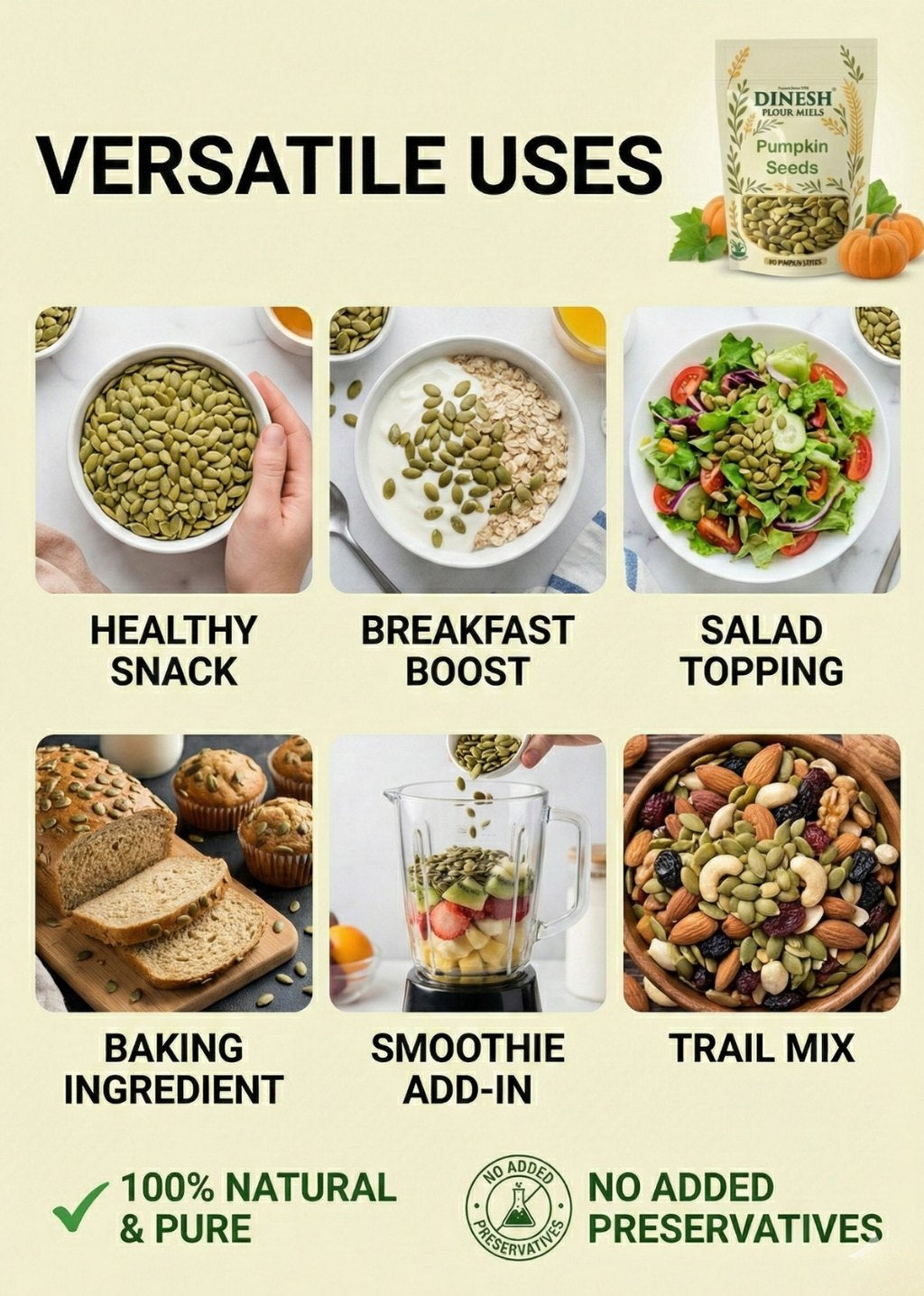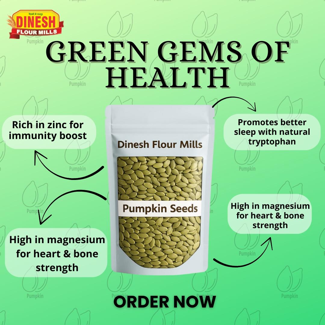 Upgrade your kitchen with raw and pure pumpkin seeds from Dinesh Flour Mills. Order today and bring home the crunch!