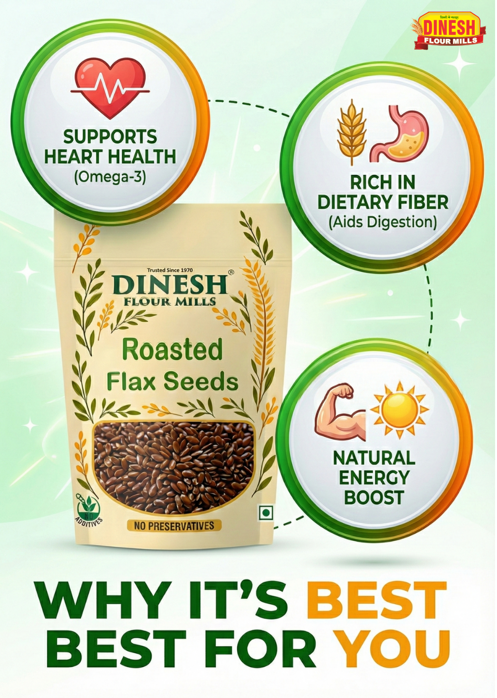Dinesh Flour Mills Roasted Flax Seeds are prepared using carefully selected flax seeds that are gently roasted to bring out their natural flavor and crunch. The roasting process makes them easy to use in everyday cooking without altering their original character.