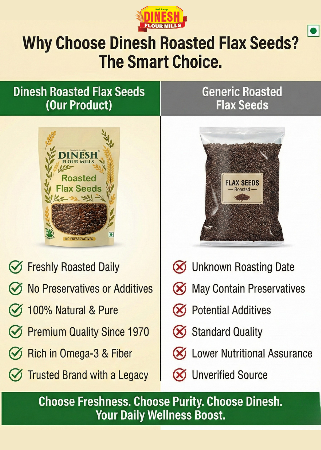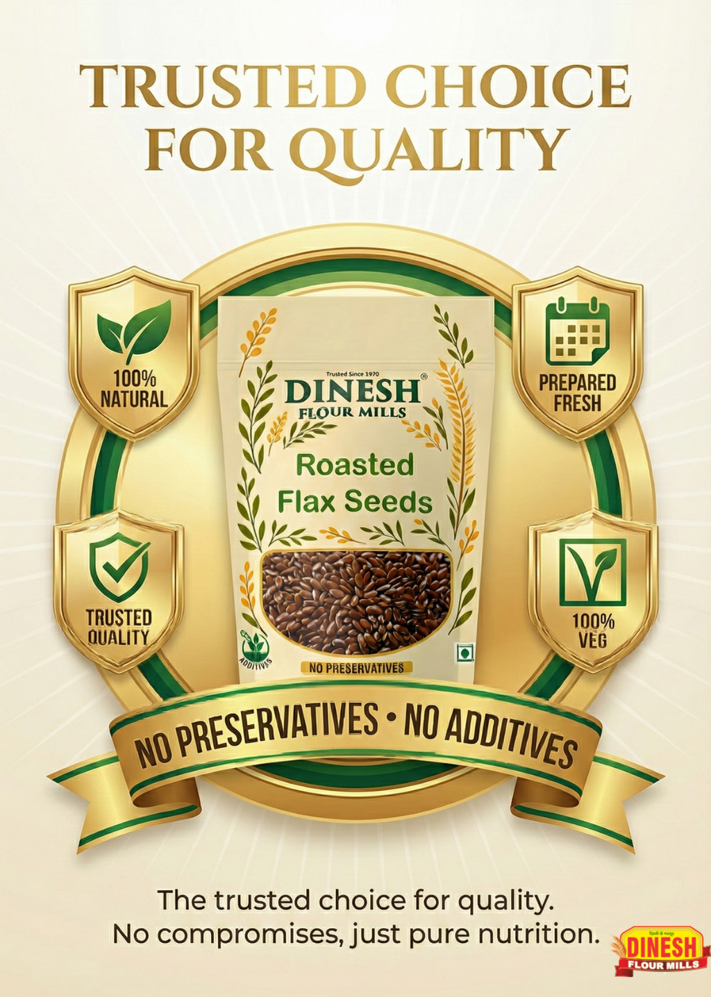 Buy Dinesh Flour Mills Roasted Flax Seeds prepared fresh, without preservatives. Natural alsi seeds for daily kitchen use.