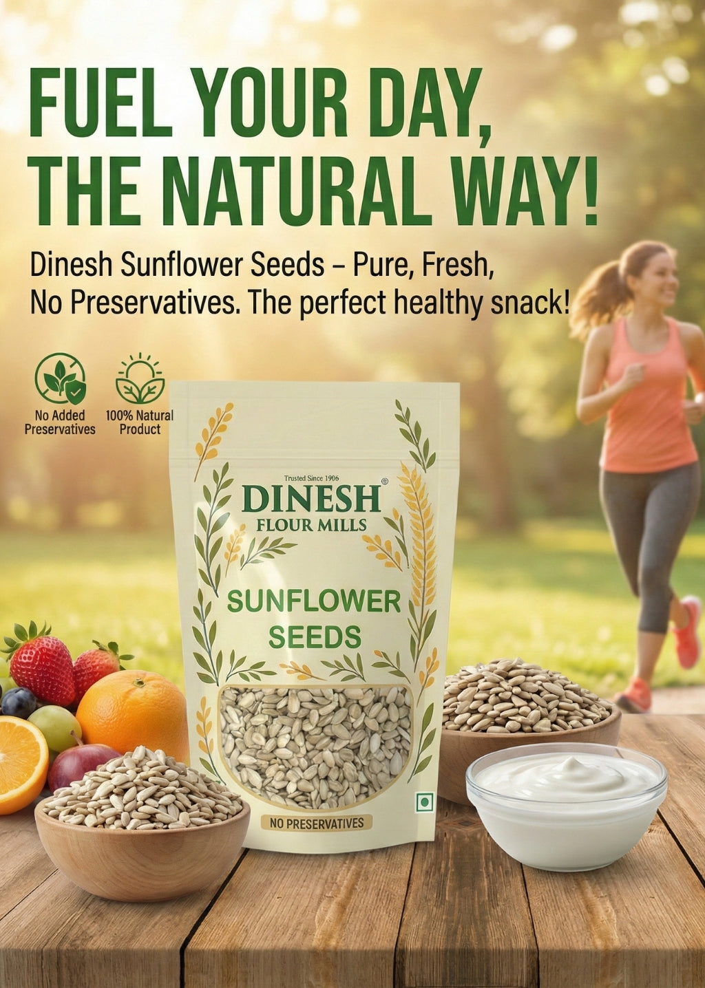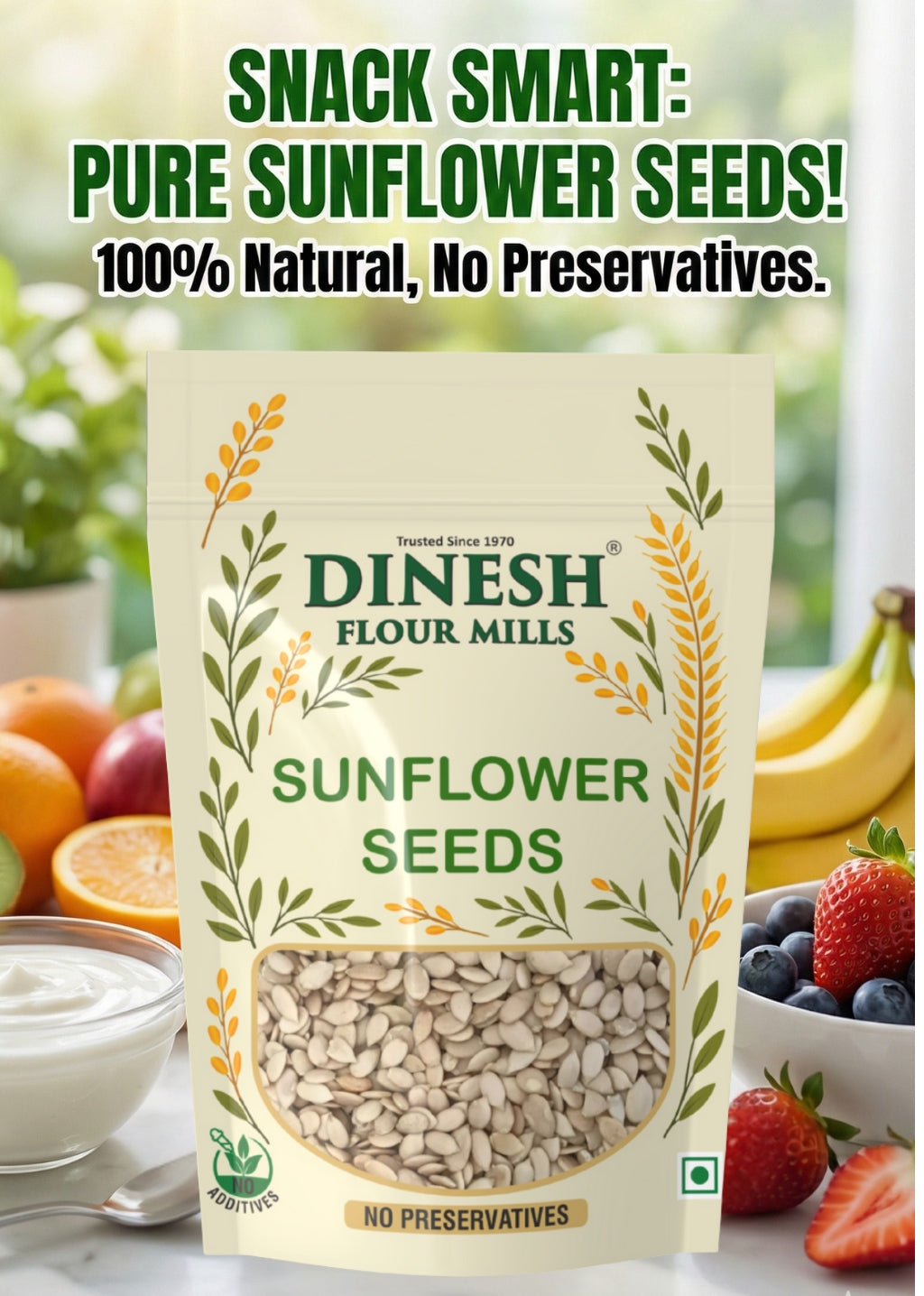 🌻Enjoy unpolished, raw sunflower seeds from Dinesh Flour Mills – preservative-free and naturally tasty. Add crunch to snacks, meals, and desserts with pure, farm-style seeds. Great for toasting, mixing, or baking – your everyday kitchen essential!